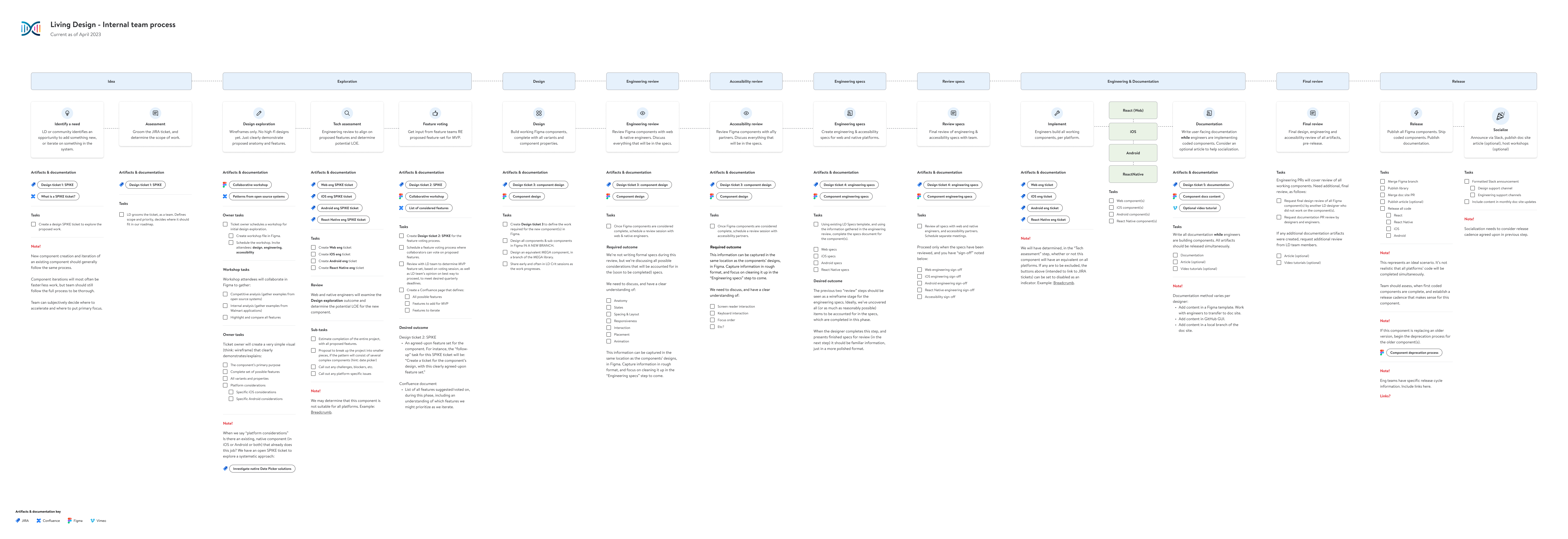 The cropped section below shows a bit more clarity. This represents our efforts to define every step in our team's process. The idea was that, if all steps could be accounted for, we minimize the chance of shipping artifacts that fail to meet user needs.
