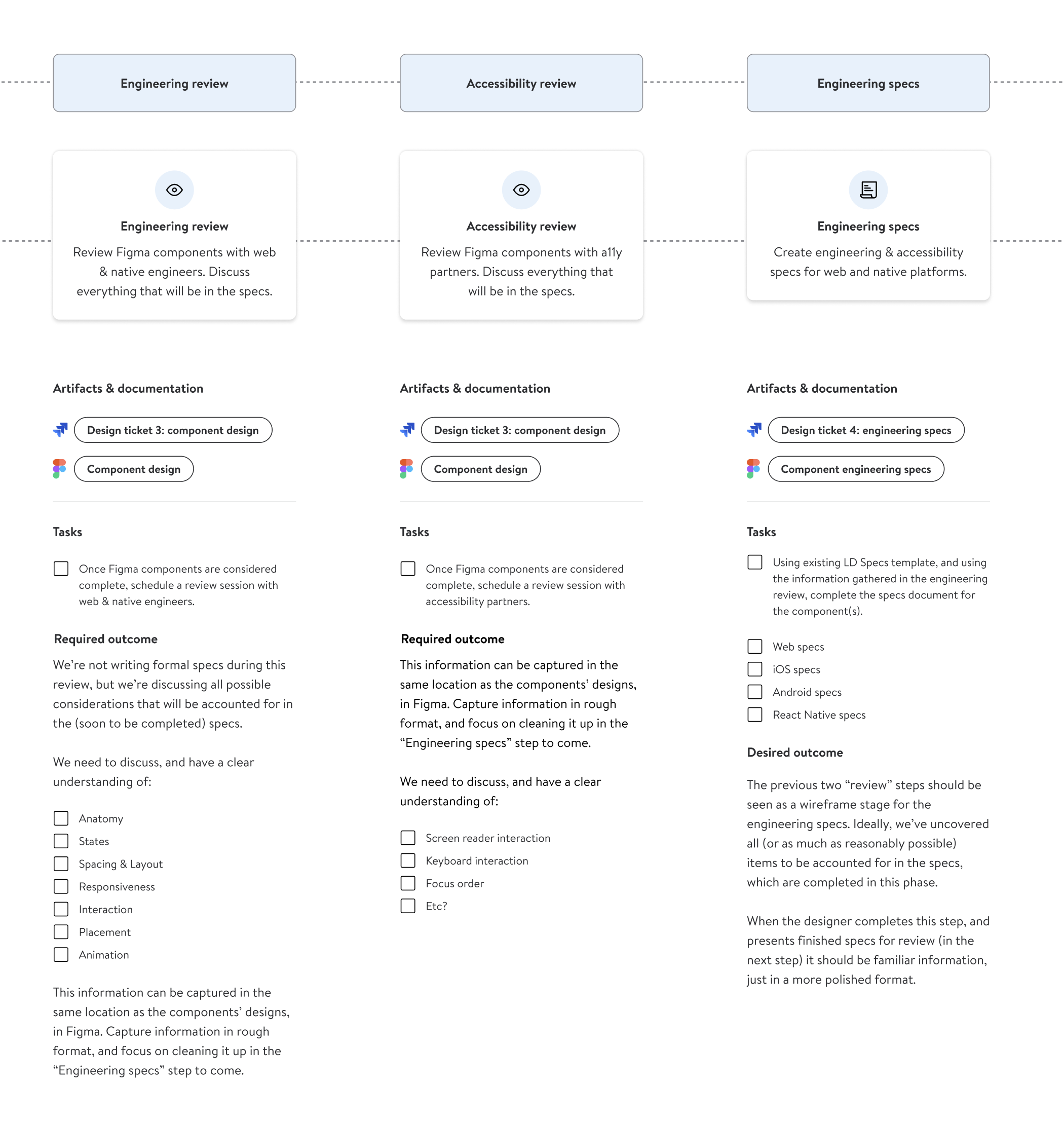 Tested over time, individual sections of this documentation were helpful tools to introduce new team members to the intricacies of design system work. But, taken as a whole, it was difficult to use as a strict tool for team collaboration. Team members need to be trusted to manage their own individual tasks with a bit more freedom.