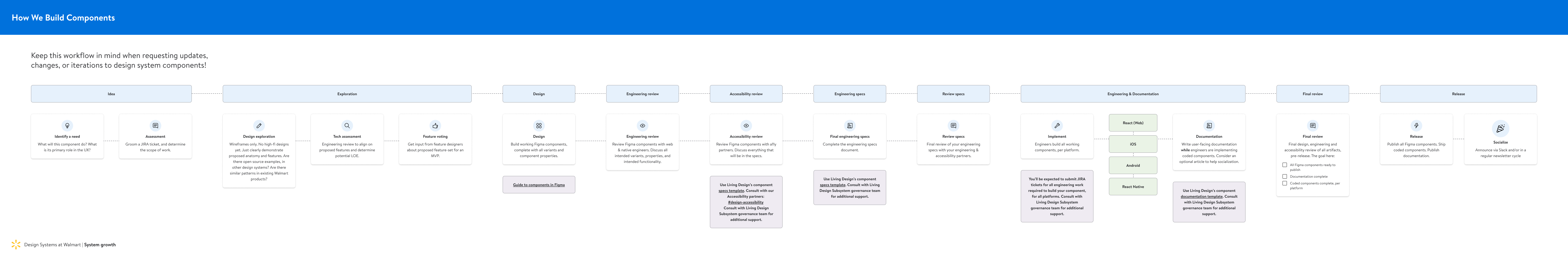 I was part of the zero-to-one effort that built the first centralized, governed design system library at Walmart. I designed and documented a governance workflow to achieve two goals: