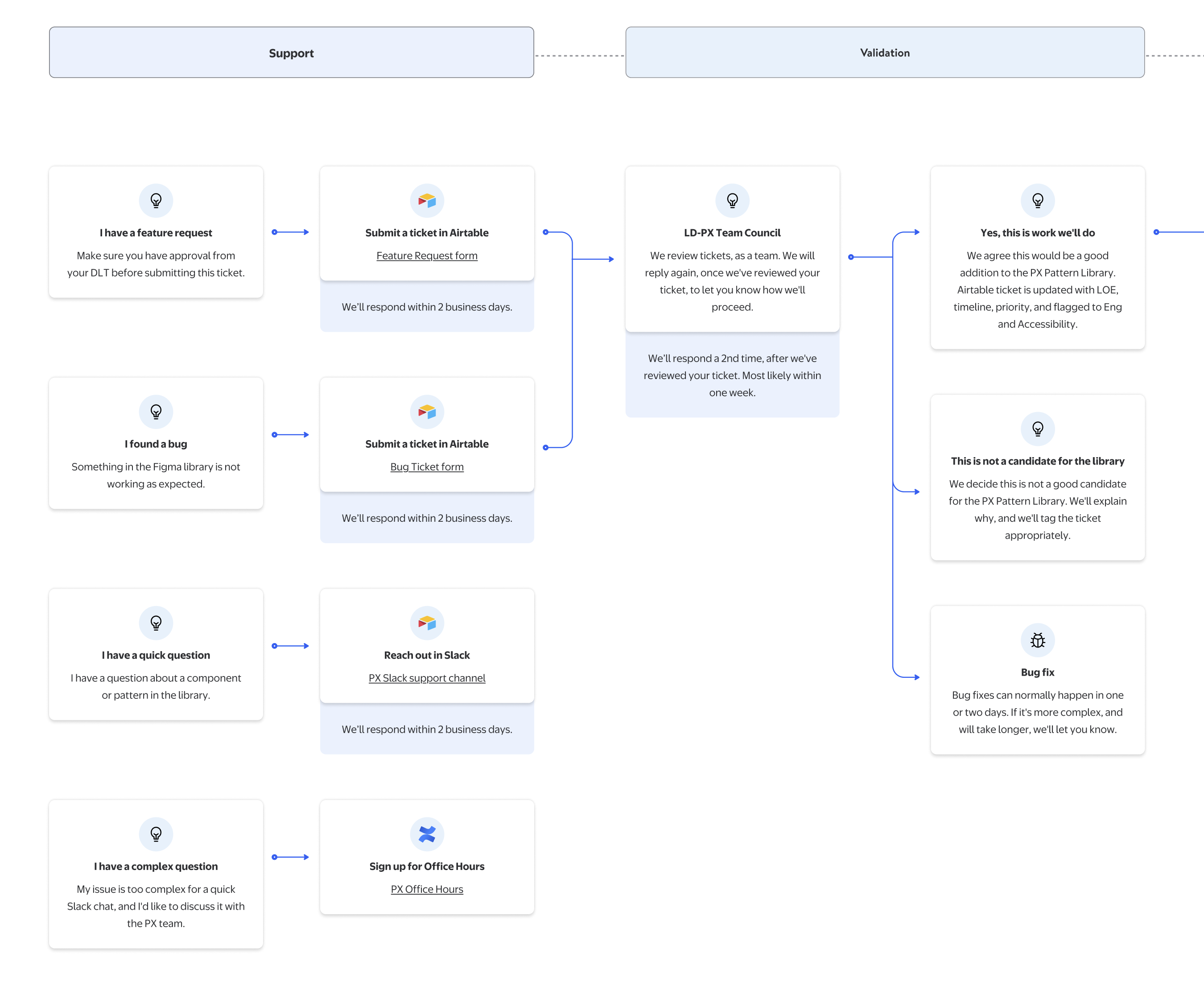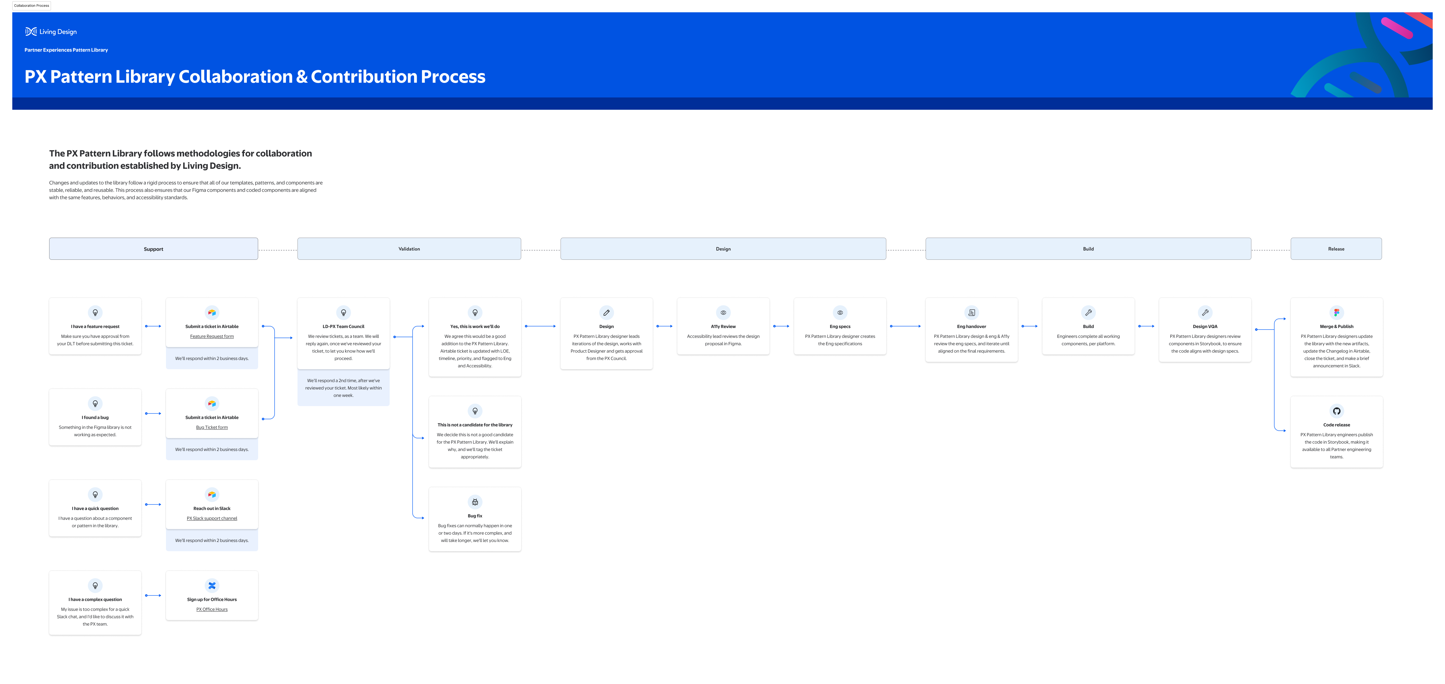 The first process I defined and documented was the basic lifecycle of new work. Clearly defining the steps involved in zero-to-one work on library components would also help us define updates and iterations. It would help us educate users on the nature of feature requests and contribution, and it would help manage user expectations.